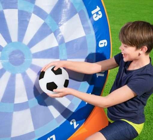 Your little champs will have a ball playing with the Bestway® Air Blast Soccer™ Yard Game! Featuring a giant, inflatable dartboard, kids can spend the day outside kicking the included soccer balls onto the stick-to-surface target. Your kids have the choice between playing in a group and competing with friends where each kick scores them points (like a life-sized darts game). Or they can have a solo practice session to work on their kicks and accuracy. Perfect for a birthday party or a backyard play date, your kids will enjoy endless hours of fun with the Bestway Air Blast Soccer Yard Game!