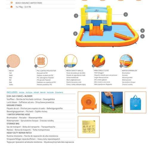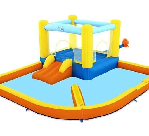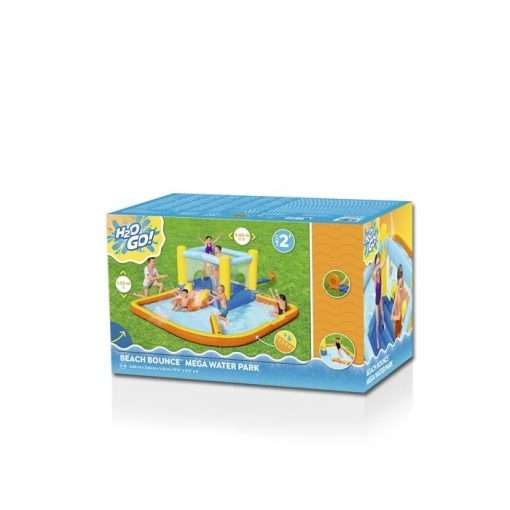 Ready, set, splash! Race the day away with the H2OGO!® Super Speedwayâ„¢ Mega Water Park. From start to finish, this giant inflatable park brings the racetrack to your backyard. The double climbing wall leads to 2 curved slides, which have a spontaneous dump bucket at the top that will randomly soak the kids as they race. At the bottom of the slide, there is a giant splash pool with 2 point ‘n spray water blasters. Plus, there are even more games for kids to play – a ball hoop with a basketball and a tunnel to adventure through. Kids will be racing and playing in no time, because the included blower inflates this entire giant water park in just 2 minutes! The park is constructed of double-stitched, PVC-coated polyester material that is super durable and provides a comfortable feel and touch for kids, keeping the fun splashing year after year. Kids can splash and race their way through summer with the H2OGO! Super Speedway Inflatable Water Park!